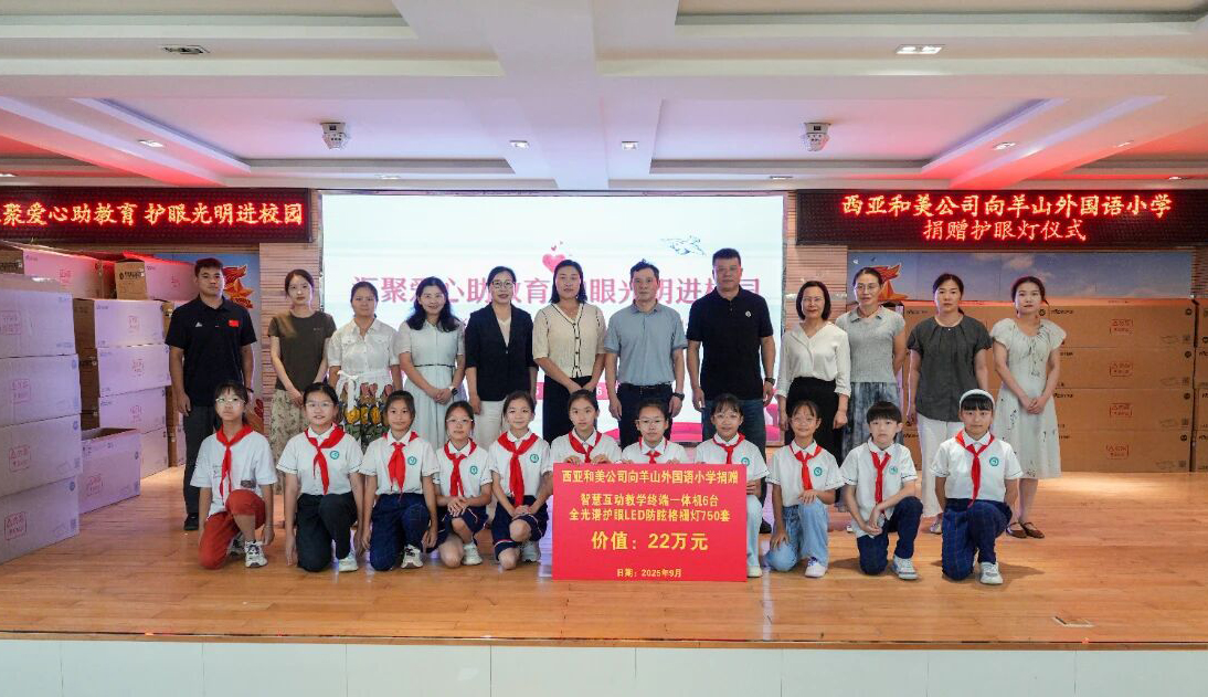 9月,新學期伊始,西亞和美公司公益助學活動走進信陽市羊山外國語小學,首批捐贈的750套全光譜護眼LED防眩格柵燈和6臺智慧互動教學終端一體機正式投入使用。這批設(shè)備不僅提升了教室的光線環(huán)境,也為師生帶來了更智能、更健康的教學體驗,這是西亞連續(xù)二十一年來推行愛心助學行動的又一暖心舉措。